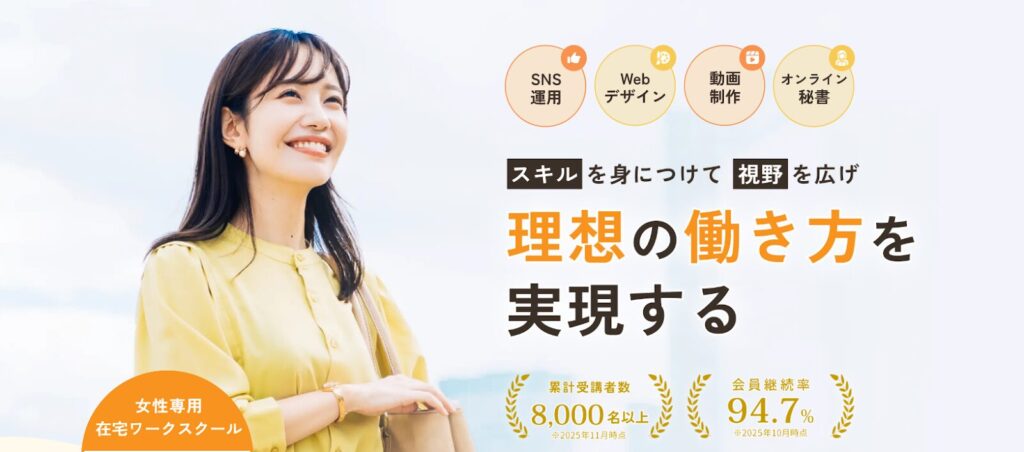 | 学べる スキル | ・SNSマーケティング ・Webデザイン ・動画編集 ・オンライン秘書 ・生成AI など | ・Webデザイン、 ・動画クリエイター ・グラフィックデザイン ・Webマーケティング など | ・Webデザイン | ・Webデザイン ・マーケティング ・ライティング ・ビジネススキル ・プログラミング ・動画編集 など | ・Webデザイン ・動画編集 ・グラフィックデザイン ・プログラミング など | ・Webデザイン ・動画編集 ・生成AI | ・Webデザイン ・Webライティング ・マーケティング ・インスタ運用代行 ・生成AI | ・経理事務 ・経理実務など |