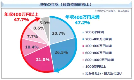 年収400万円以上が47.7%、400万円未満が47.2%と大体半数ずつ。つまり安定している人もいれば、思うように伸びていない人も同じくらいいるということ。