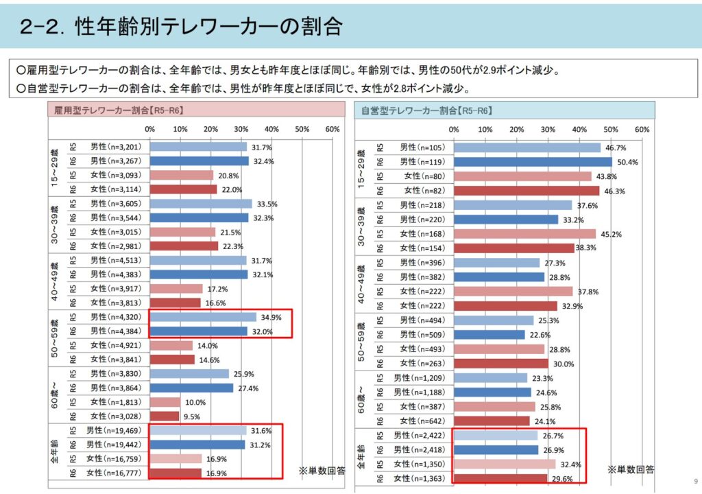 令和6年度の「テレワーク人口実態調査」によると、いわゆる在宅ワークを含む「自営型テレワーカー」は、全年齢の女性で約3割程度にとどまっています。