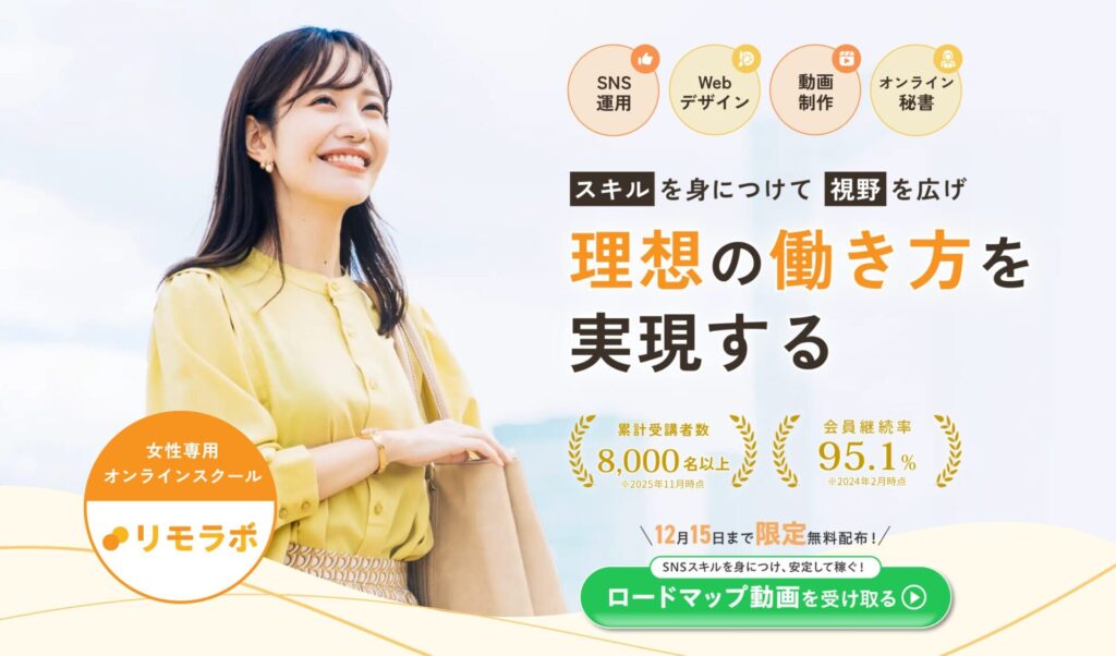 リモラボは、国内最大級のSNS運用代行スクールです。8,000名を超える卒業生のうち、受講者の80.4%が仕事獲得できており、平均4.3ヶ月で仕事獲得することができています。