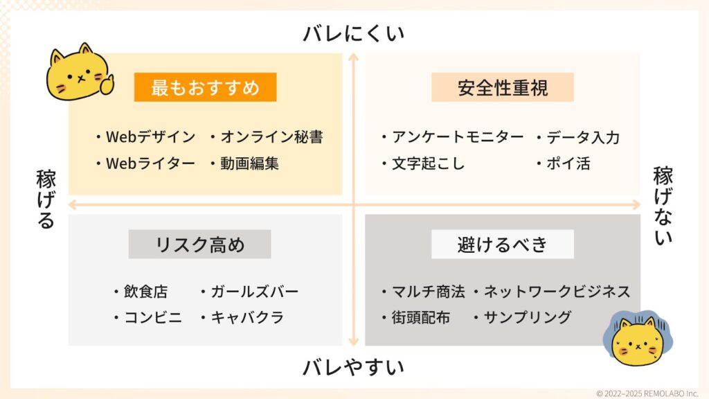 収入は安定しますが、人にバレやすいのがこのゾーン。人に見られるリスクが高く、副業禁止の会社員には不向きです。