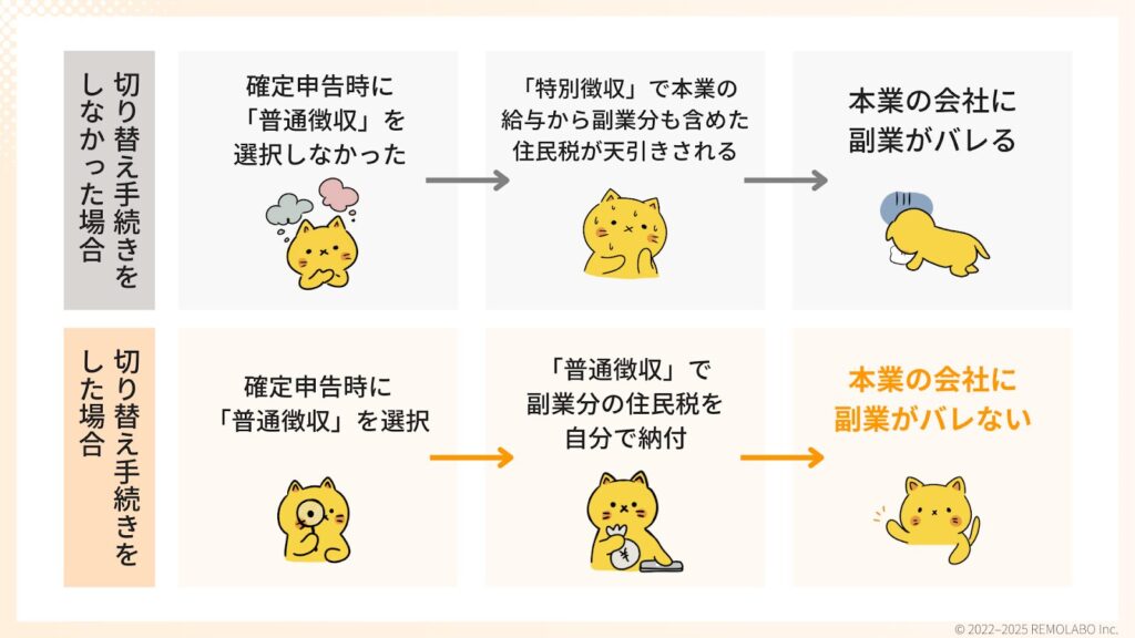 一方、「普通徴収」を選んで自分で納付するようにすれば、会社に届くのは本業の給与に対する住民税の通知だけになります。これで税金による会社バレを防げるんです。万が一確定申告時に「普通徴収」にチェックを入れ忘れると、自動で「特別徴収」になるケースがあります。このチェックを怠り、うっかり会社にバレる人が多いので、申告時には必ず確認しましょう。