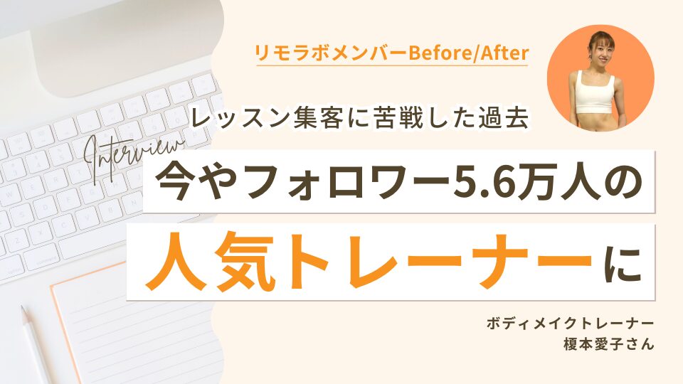 今回の記事ではコロナ禍で集客に苦戦したものの、今ではインスタフォロワー5.6万人のボディメイクトレーナーとして活躍する榎本愛子さんにインタビューしました。リモラボ参加をきっかけに、飛躍をとげた背景に迫ります。