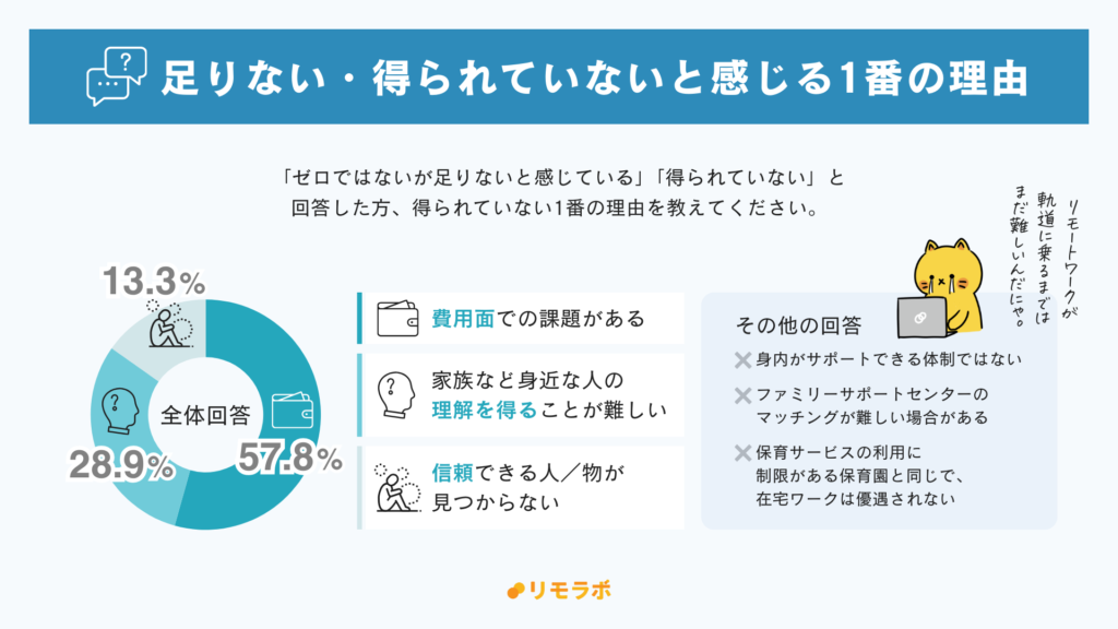 また、外部のサービスを利用することに対して、「家族などの身近な人の理解を得ることが難しい」「サービスはあるけれども在宅ワークは優遇されない」「マッチングが難しいなど」さまざまな課題が見受けられました。