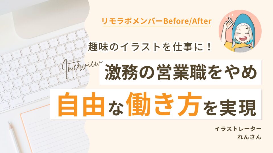 過去に会社員で営業をバリバリしていたれんさん。知り合いからデザインの仕事をいただくようになり、趣味のイラストを仕事にしたいと思い、リモラボに参加。