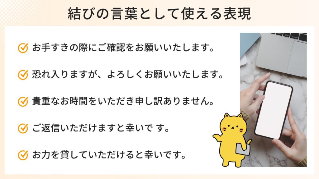 結びの言葉としてつかえる表現には、次のようなものがあります。