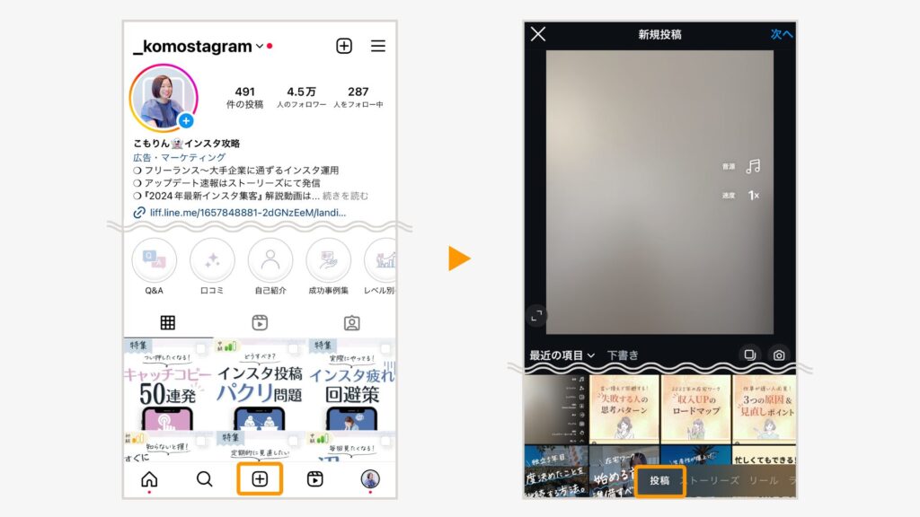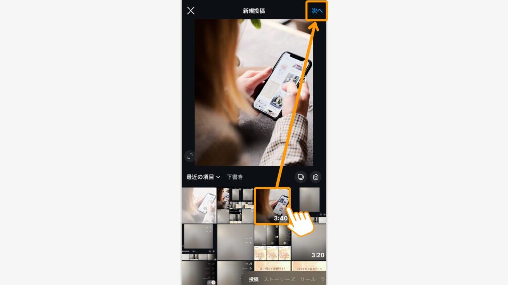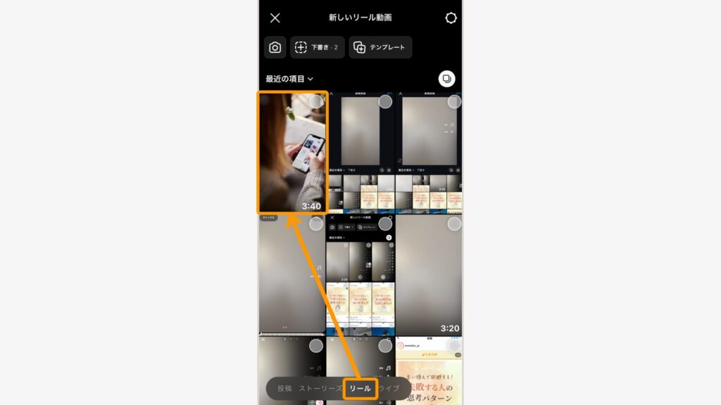 リール投稿画面を開く