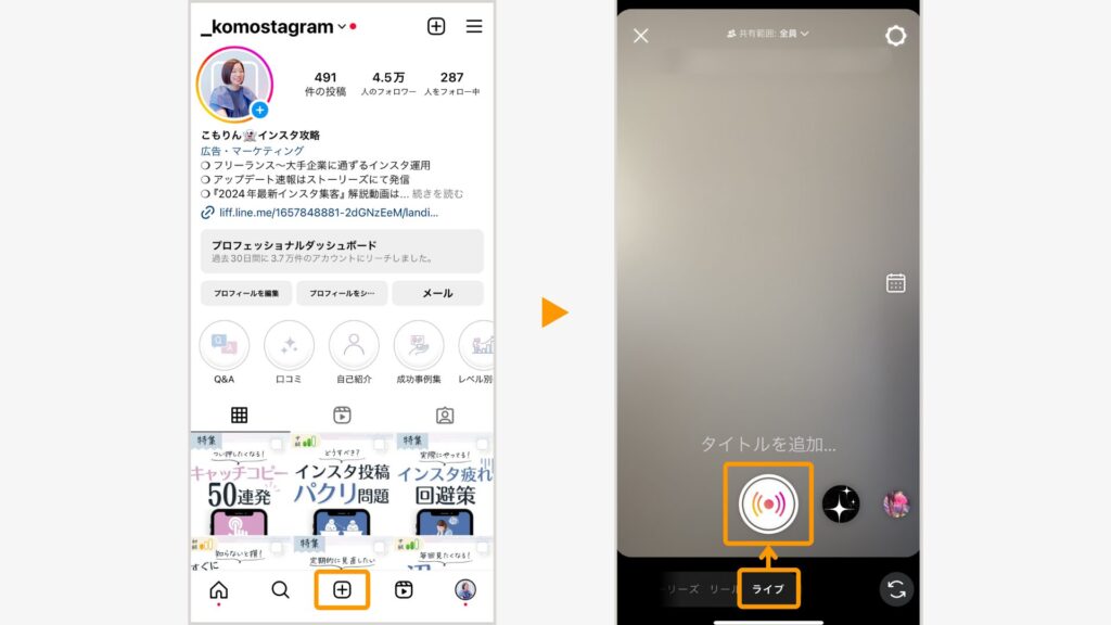 画面下の「+」ボタンから「ライブ」を選び、配信を開始します。