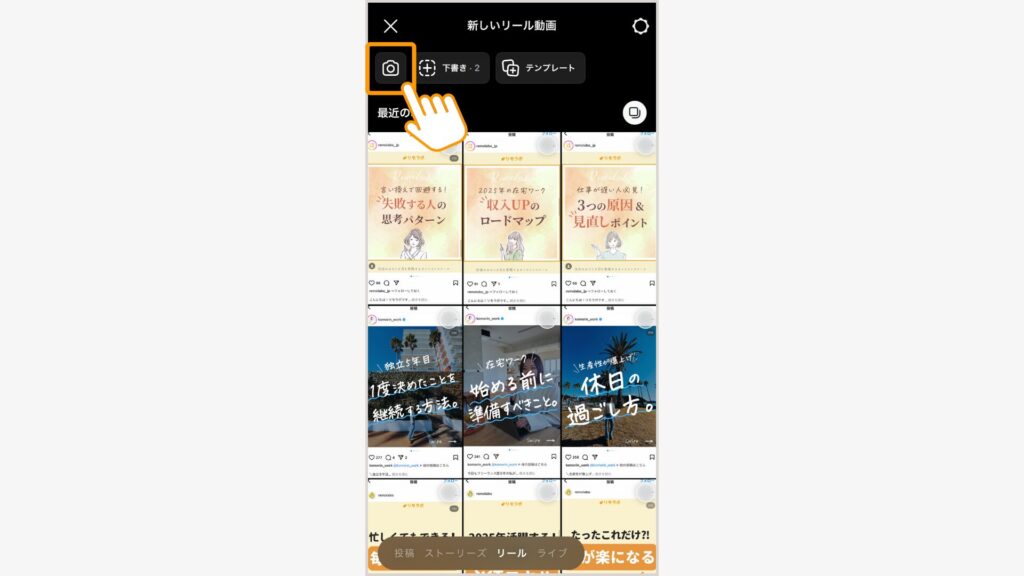 リール画面で直接撮影する場合は、左上のカメラマークをタップします。