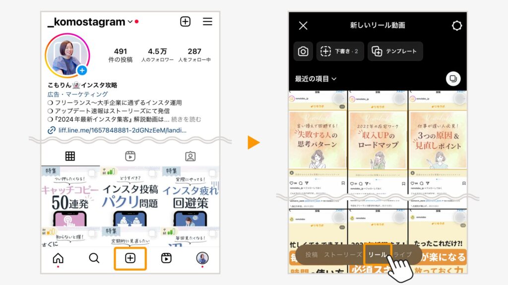 インスタアプリを開き、画面下部中央の「+」をタップ>「リール」を選択します。
